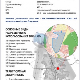 Хороший ровный участок для коммерческого использования . <br>Расположен в логистически удобном месте с хорошей транспортной доступностью. <br>Находится в 0.5 км от Каширского шоссе, в 2, 5 км от М-4 Дон, 6 км до ЦКАД. От МКАД 36 км. <br>По ПЗЗ Зона МФ - Многофункциональная...