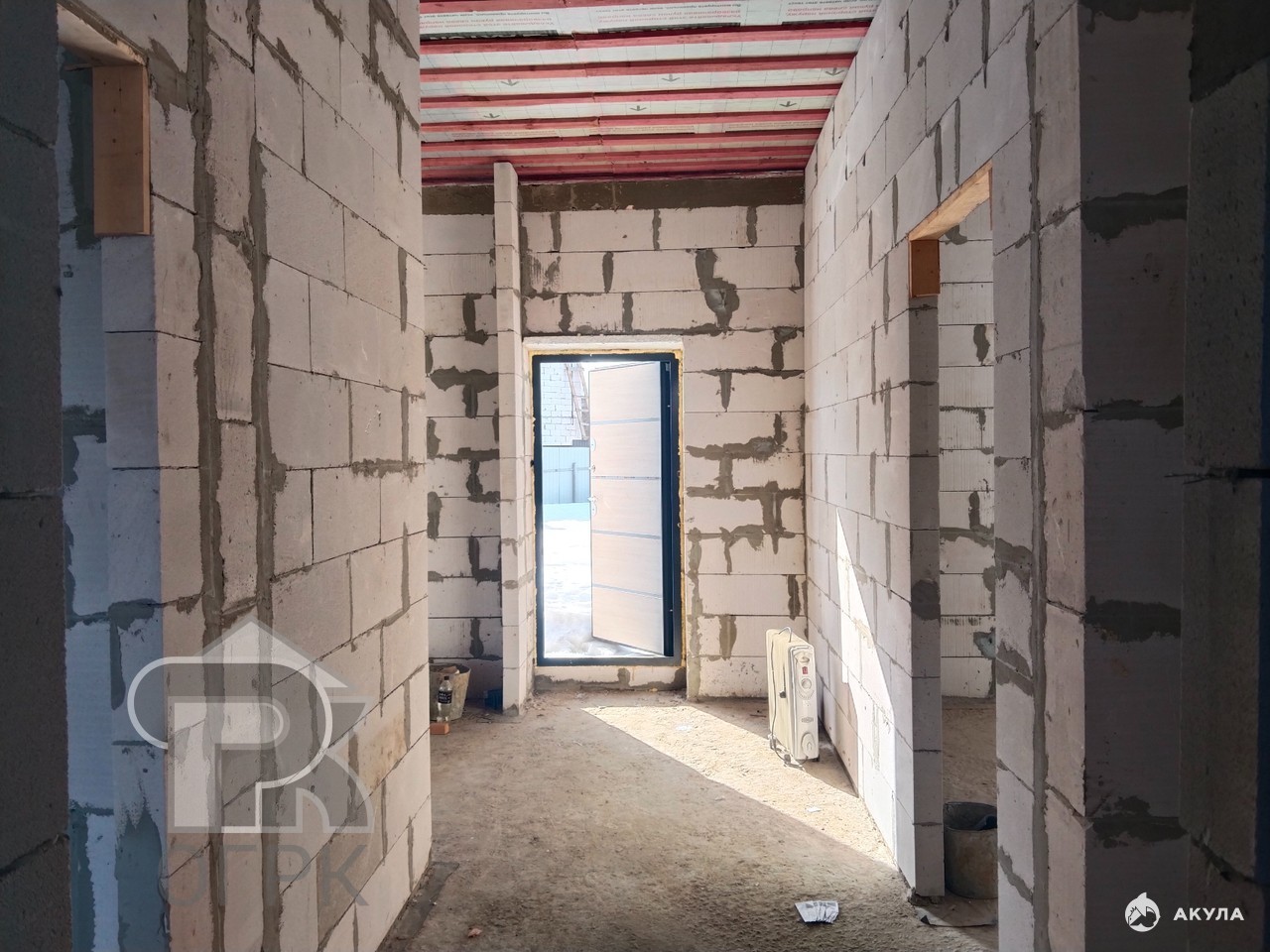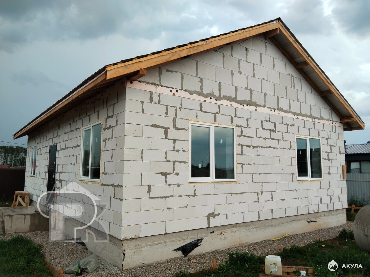 Дом построен из газоблока (400 мм), 2-ой этаж мансардный (высота под коньком 2, 2 м позволяет расположить дополнительно 2 комнаты), крыша утеплена (200 мм), окна Rehau, дверь металлическая.