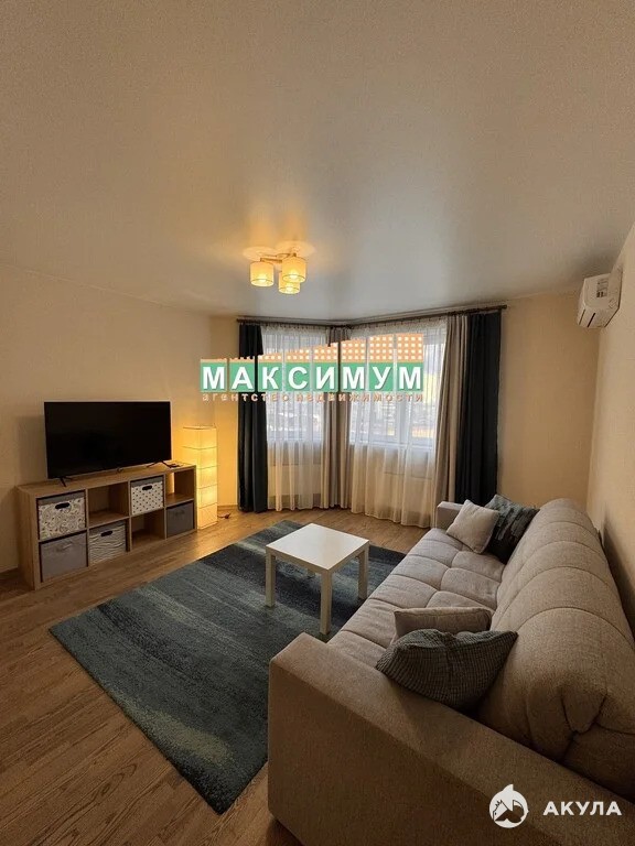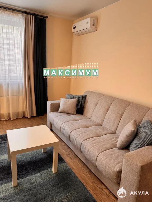 Жилая комната: раздвижной диван, журнальный столик, кондиционер, тумба под ТВ, телевизор со смарт ТВ.
